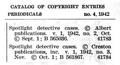 On October 1, 1942 was The Creston Publishing Company and Albert Publications registered co-ownership of the copyrighted title, Spotlight Detective Cases with the U.S. Patent Office.